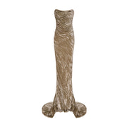 STRAPLESS DRAPED VELVET GOWN WITH BACK TAIL