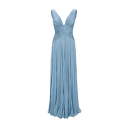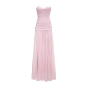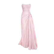 Strapless hand-pleated Satin-like draped dress with slit and cape