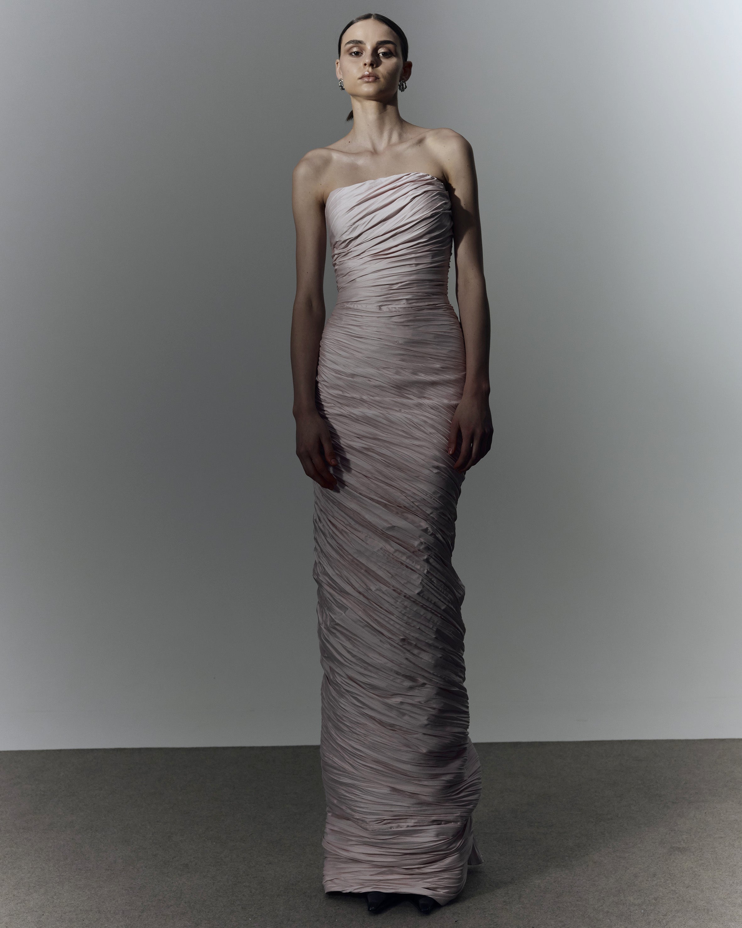 Strapless hand-pleated Satin-like draped dress with slit and cape