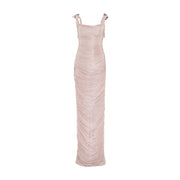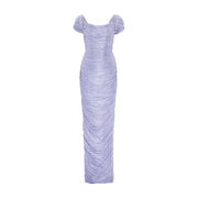 Off shoulder, hand pleated draped Satin-like gown with soft wires on top