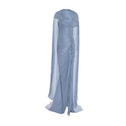 LEANDRA - ASYMMETRICAL PLEATED SILK GOWN WITH FRINGES AND ONE-SHOULDER CAPE