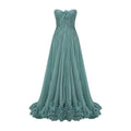 Strapless silk chiffon hand pleated dress with embroidered bust.