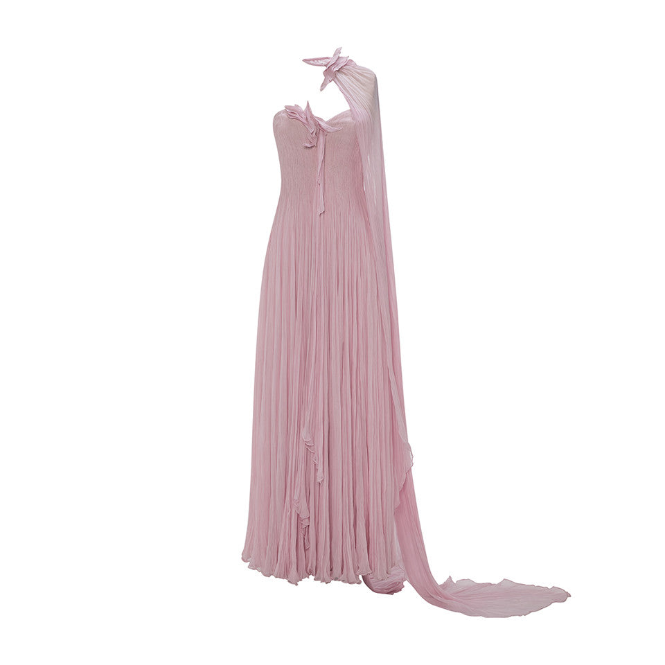 ONE SHOULDER DRAPED SILK ROSEYA HAND PLEATED GOWN
